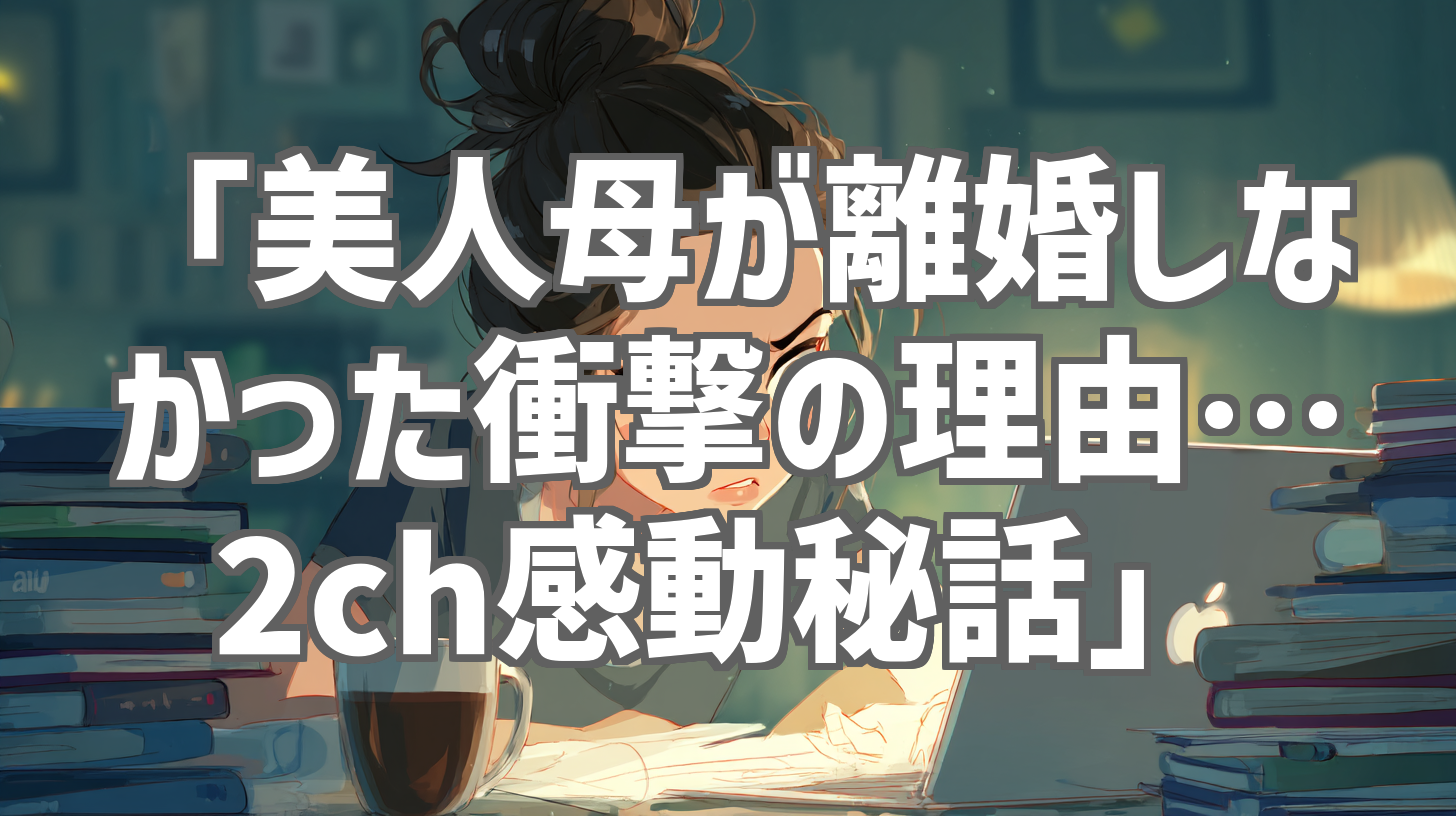 2chの感動秘話って、短い時間で心を揺さぶられるものが多いですよね。今回ご紹介するのは、「【2ch ショート】涙の中心で愛を叫ぶ」チャンネルで公開された「超美人な母が父と別れなかった本当の理由とは…【2ch 感動】#2ch」という動画。たった59秒の中に、家族の温かさと夫婦の愛情がぎゅっと凝縮されていて、思わずホロリと来てしまいました。美人の奥さんがなぜ離婚しなかったのか? その理由を知った時、胸が熱くなること間違いなしです! 早速、動画の内容をチェックしていきましょう。