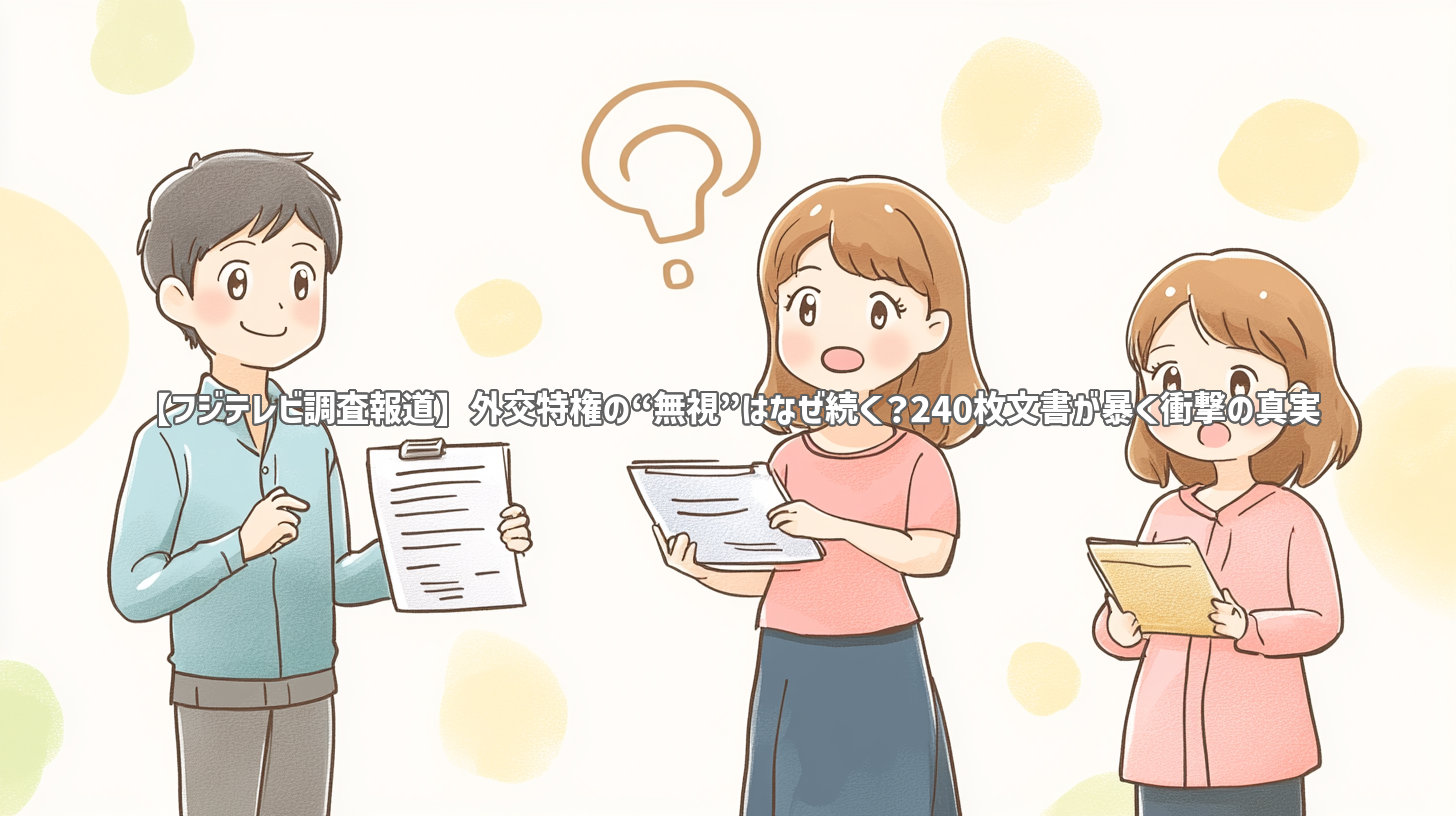 「【フジテレビ調査報道】外交特権の“無視”はなぜ続く?240枚文書が暴く衝撃の真実」というタイトルが示す通り、この動画では、日本国内で横行する外交官による交通違反や駐車違反の実態、そしてそれに対する日本政府の対抗策がなぜ機能しないのかを、独自に入手した240枚に及ぶ政府文書に基づいて徹底的に検証しています。