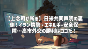 最近、ニュースをチェックしていて、特に気になったのが日米共同声明。でも、正直なところ、ニュース記事を読んだだけでは、その真意や背景にある複雑な事情まで理解するのは難しいと感じていました。そんな時、YouTubeのおすすめに表示されたのが、上念司さんのチャンネル「ニュースの虎側」の動画。「日米共同声明の「うますぎる中身」を徹底解説!イラン情勢、ホルムズ海峡、エネルギー安全保障まで一気に!?高市外交の絶妙すぎる勝ち筋を読み解く!」というタイトルに惹かれ、早速視聴してみました。上念さんの解説はいつもながらに鋭く、そして分かりやすい!まるで自分が国際政治の専門家になったかのような気分になれるんです。今回の記事では、この動画の内容を詳しくレビューし、日米共同声明の裏側にある、私たちが知っておくべき重要なポイントをまとめていきます。