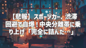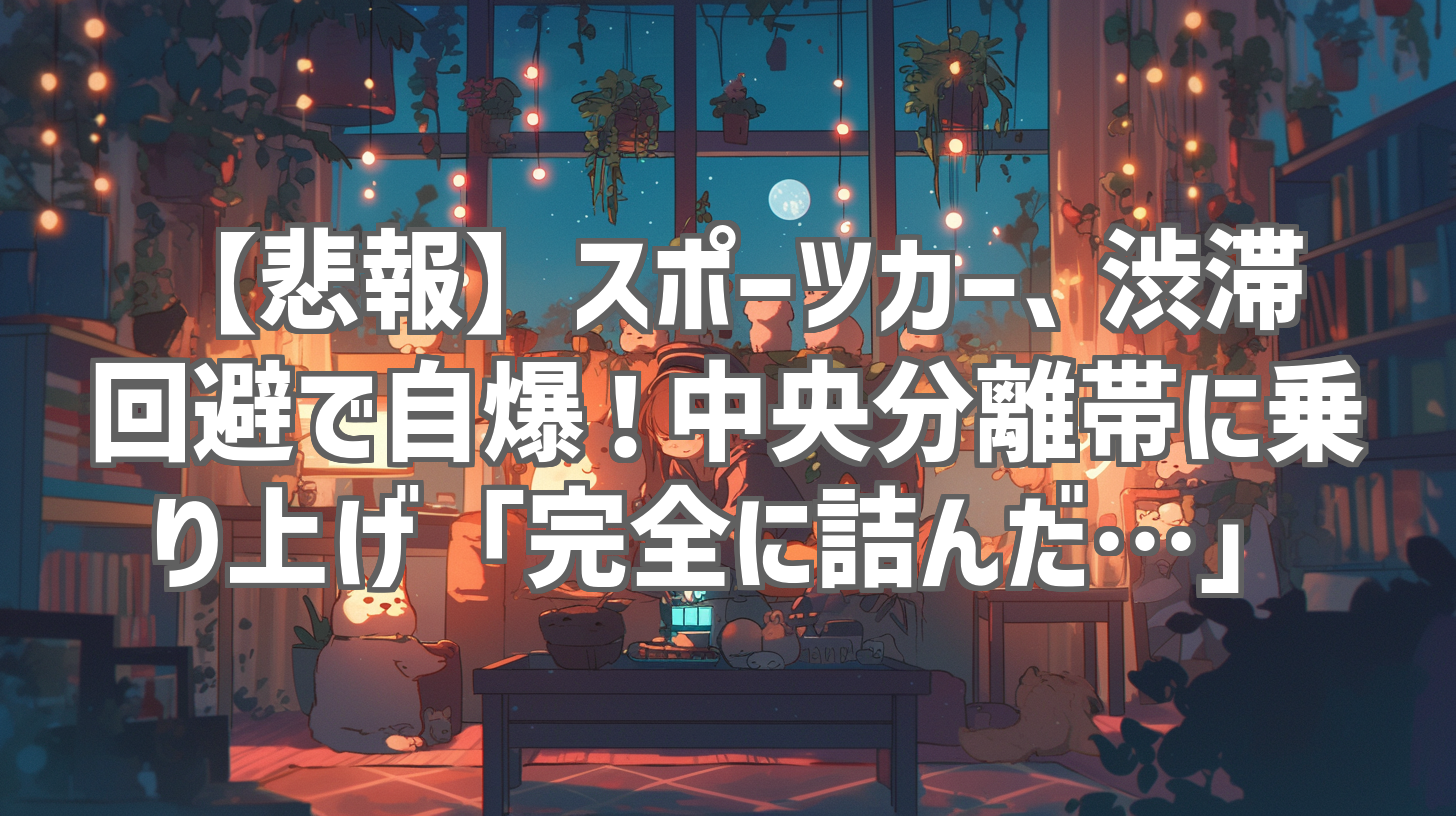 【悲報】スポーツカー、渋滞回避で自爆!中央分離帯に乗り上げ「完全に詰んだ…」
