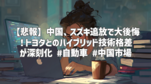 最近、自動車業界を騒がせているニュースがあります。それは、中国がかつてパートナーだったスズキを追放したことによる後悔、そして、それが引き金となり深刻化しているトヨタとのハイブリッド技術における格差です。この動画では、その背景と現状について、わずか52秒という短い時間の中で分かりやすく解説されています。一体何が起こっているのか?詳しく見ていきましょう。