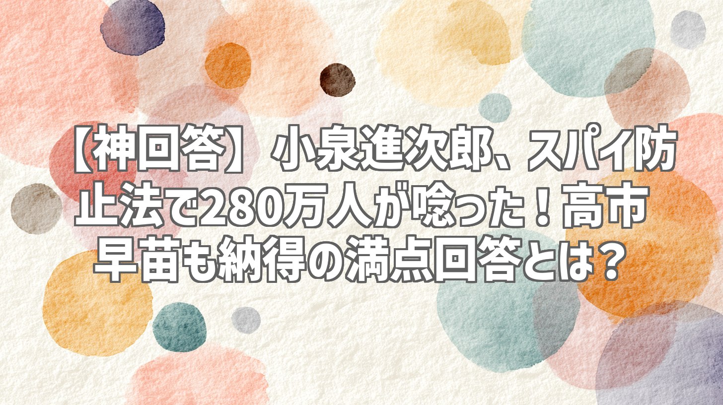最近、YouTubeで政治系の動画をチェックするのが日課になっている私。中でも「ズバッと国会」さんのチャンネルは、短い時間で核心をつく切り口が面白くてよく見ています。今回、特に目を引いたのが、「【小泉進次郎】スパイ防止法について満点回答を叩き出す小泉大臣」という動画。なんと280万再生(記事執筆時点では137万回再生ですが!)を超えているとのこと。小泉進次郎さんの発言がここまで多くの人の関心を集めているとは驚きです。高市早苗さんも納得の回答とは一体…?早速、内容を深掘りしていきましょう!