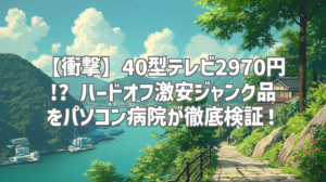 動画は、パソコン病院のメンバーがハードオフ店内を歩き回るシーンから始まります。ジャンク品コーナーを物色する様子は、見ているこちらもワクワクしますね!様々な商品が並ぶ中で、ひときわ目を引くのが、今回の主役、2970円の40インチテレビです。