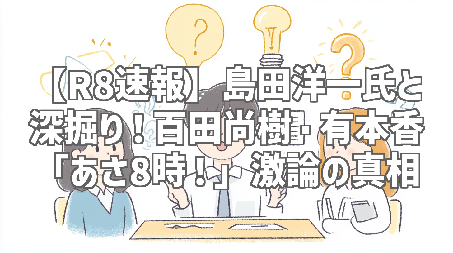 待ちに待った「ニュースあさ8時!」、通称あさ8の最新回が公開されました!今回のゲストは、なんと島田洋一氏。百田尚樹氏、有本香氏とのトリオで、一体どんな激論が繰り広げられるのか、開始前からワクワクが止まりませんでした。2時間超えの長尺動画でしたが、全く飽きさせない濃密な内容に、あっという間に時間が過ぎてしまいました。特に、最近話題になっているR8速報(動画の冒頭で語られる内容)について、島田氏ならではの視点からの深掘り解説は必見です!一体どんな内容だったのか、早速レビューしていきましょう!
