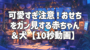 動画が始まると、まず目に飛び込んでくるのは、つぶらな瞳で一点を見つめる赤ちゃん。そして、その隣には、同じ方向をじっと見つめるワンちゃん!二人の視線の先には、なんと豪華なおせち料理が!お正月ならではの光景ですが、赤ちゃんもワンちゃんもおせちに興味津々の様子が、めちゃくちゃ可愛いんです。