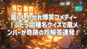 いやー、今回の「嵐にしやがれ」ぶどう品種名クイズ、本当に最高でしたね!たった59秒のショート動画の中に、嵐メンバーそれぞれの個性がギュッと詰まっていて、何度も見返したくなる中毒性があります。大野さんの天然ボケ、櫻井さんの惜しい解答、相葉さんの奇抜な発想、ニノのミステリアスなボケ…どれもが嵐らしさ全開で、まさに「神回」と呼ぶにふさわしい一幕でした。