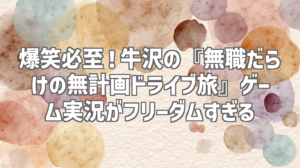 | 記事タイトル | 爆笑必至!牛沢の『無職だらけの無計画ドライブ旅』ゲーム実況がフリーダムすぎる |