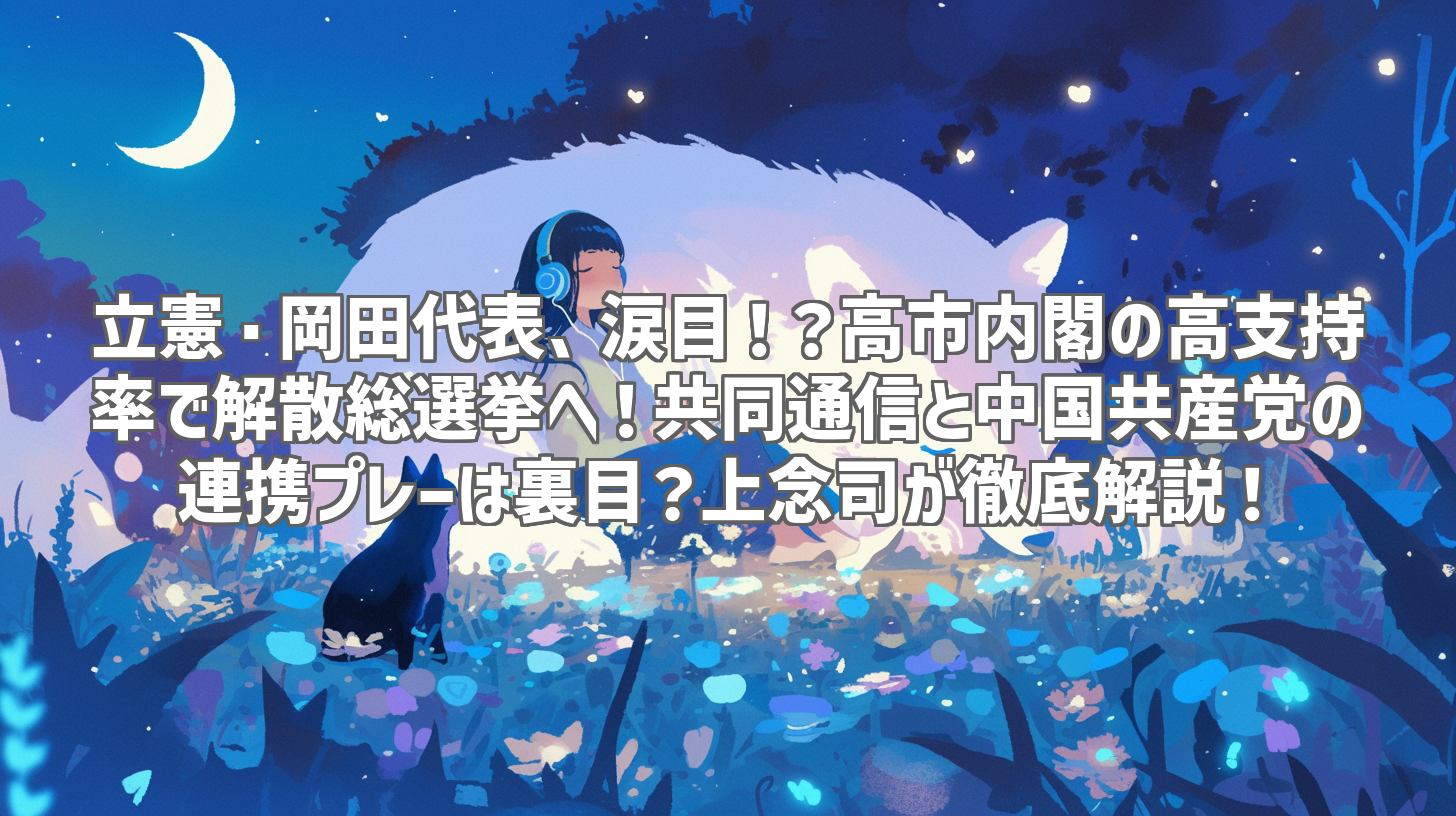 政局が大きく動こうとしている今、上念司さんのチャンネル「ニュースの虎側」から目が離せません!今回の動画では、立憲民主党の岡田代表が涙目になるほど(!?)の高市内閣支持率、そして解散総選挙の可能性について、上念さんが独自の視点で徹底解説しています。共同通信と中国共産党の連携プレー疑惑まで飛び出し、まさに情報満載!政治に興味がある人はもちろん、ニュースを深く理解したい人にも必見の内容です。早速、動画の内容をチェックしていきましょう!