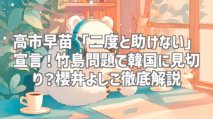 | 動画タイトル | 「二度と助けない」高市氏が下した断交級の決断。竹島周辺を飛んだ韓国軍の代償と、無視(スルー)された李在明氏の悲痛な懇願の全貌 | 櫻井よしこ |