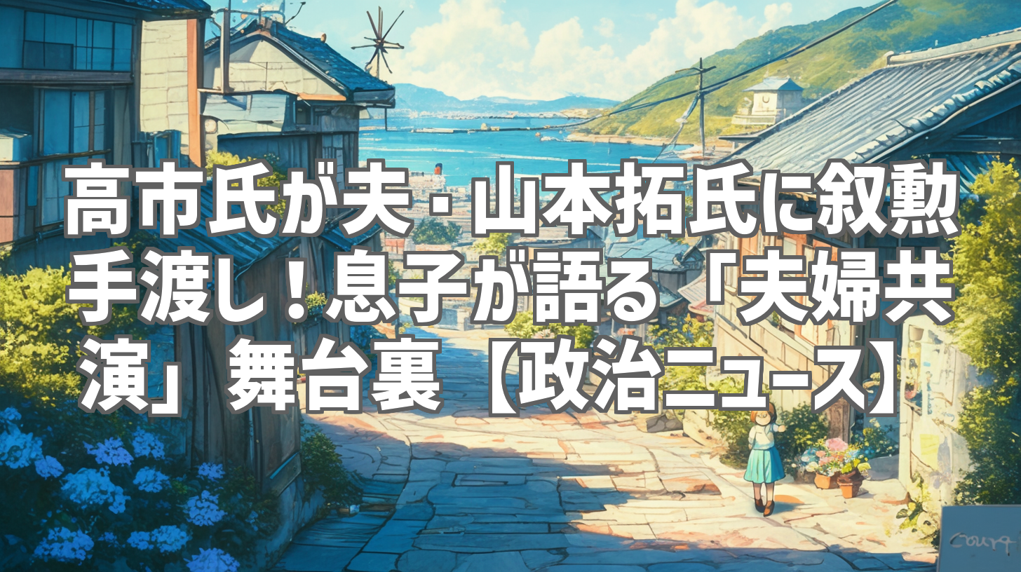 | 記事タイトル | 高市氏が夫・山本拓氏に叙勲手渡し!息子が語る「夫婦共演」舞台裏【政治ニュース】 |