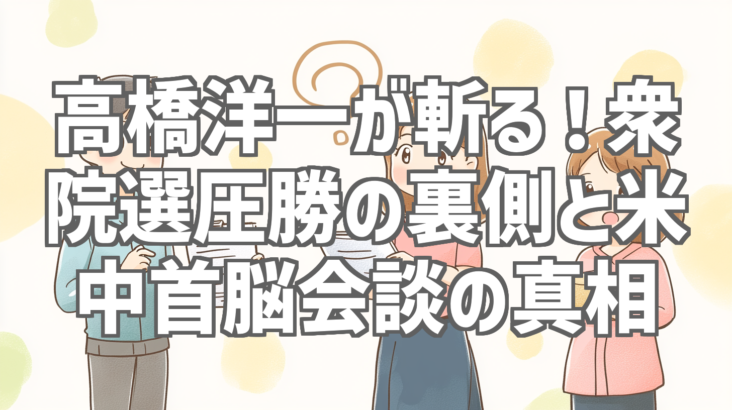 今回の動画は、経済学者・高橋洋一氏が、衆議院選挙の圧勝劇の裏側と、激動する国際情勢、特に米中首脳会談の真相について鋭く分析する内容となっています。選挙結果を数字で冷静に読み解き、今後の日本経済への影響まで見据えた、非常に見応えのある動画です。政治経済に関心のある方はもちろん、そうでない方も、高橋氏の明快な解説で、ニュースをより深く理解できるはずです。