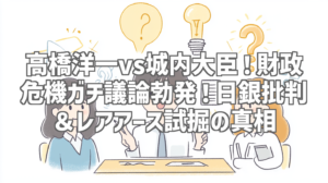 先日、YouTubeのおすすめに突如現れたのが、静岡朝日テレビニュースが公開した「【高橋洋一が斬る】城内大臣がスタジオに!生出演で財政危機に反論」という動画。タイトルからして、これは面白そうだ!と食いついてしまいました。高橋洋一氏と城内実経済財政担当大臣という、経済界の重鎮二人が、財政危機についてガチ議論を繰り広げるというのですから、見逃すわけにはいきません。しかも、日銀批判やレアアース試掘といった、刺激的なキーワードも散りばめられています。約50分という長尺動画ですが、経済の最前線を知るにはまたとない機会だと感じ、早速視聴してみました。今回は、その内容を詳しくレビューしていきたいと思います。