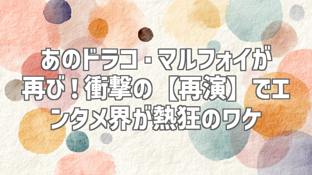 あのドラコ・マルフォイが再び!衝撃の【再演】でエンタメ界が熱狂のワケ 皆さん、こんにちは!人気YouTubeレビューブロガーの[あなたのブログ名]です。今日はもう、興奮が止まらないニュースを持ってきましたよ!あのハリー・ポッターシリーズで、誰もが... -