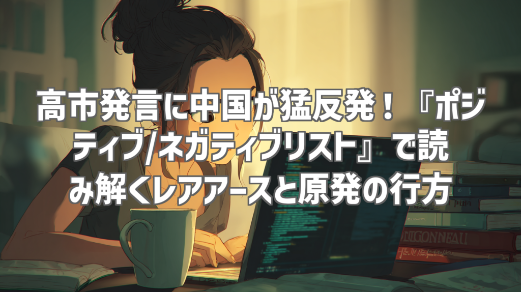 高市発言に中国が猛反発!『ポジティブ/ネガティブリスト』で読み解くレアアースと原発の行方 政治や国際関係のニュースって、難解な専門用語が多くて、正直「うーん…」と首を傾げてしまうこともありますよね。でも、そんなニュースの裏側にある本質を、と... -