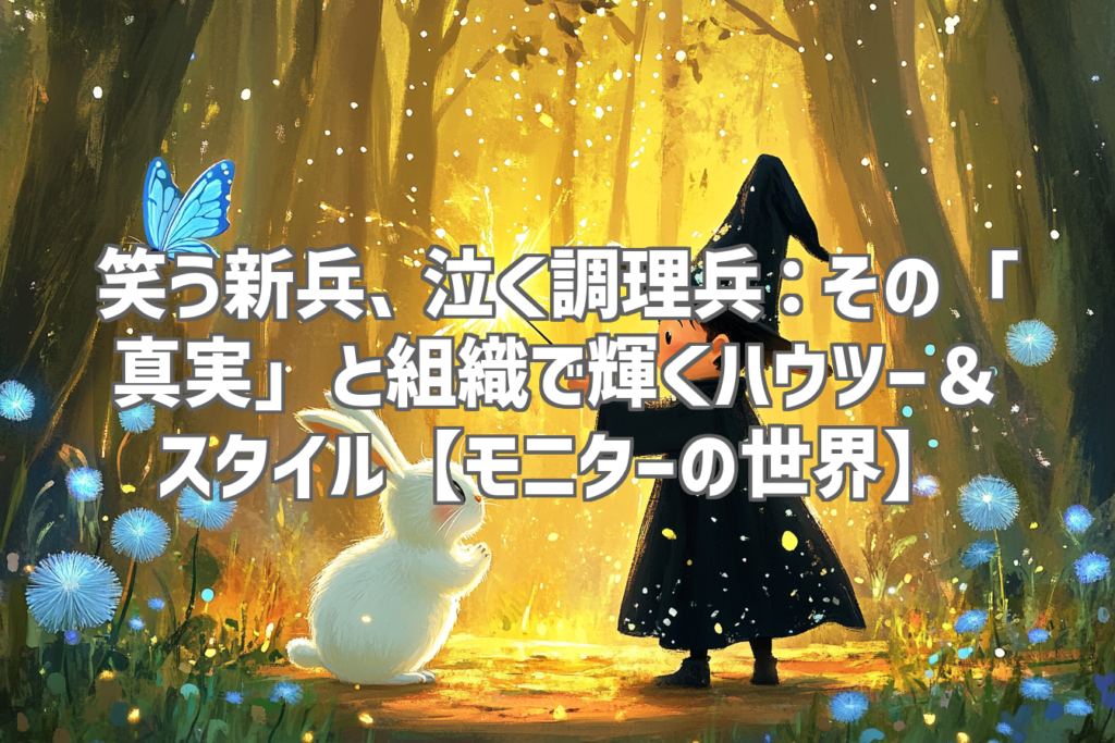 笑う新兵、泣く調理兵:その「真実」と組織で輝くハウツー&スタイル【モニターの世界】 YouTubeを日々巡回している皆さん、こんにちは!今回ピックアップするのは、短いながらも心に深く刺さるメッセージが込められた一本、「新兵は笑い、調理兵は泣いて... -