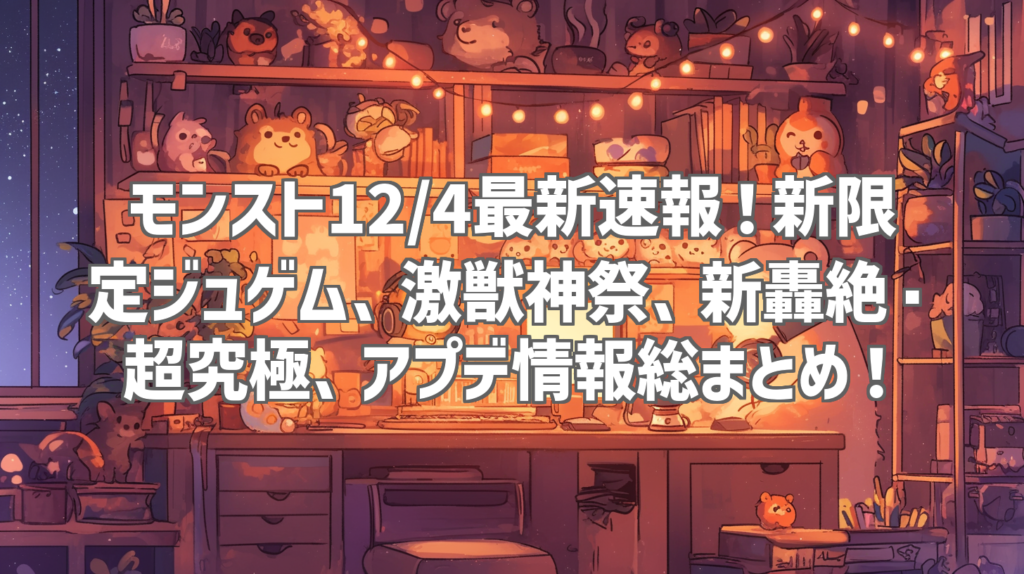 モンスト12/4最新速報!新限定ジュゲム、激獣神祭、新轟絶・超究極、アプデ情報総まとめ! モンストユーザーの皆さん、こんにちは!人気YouTubeレビューブロガーの[あなたのブロガー名]です! いやー、今回の「モンストニュース[12/4]」は本当にヤバかった... -