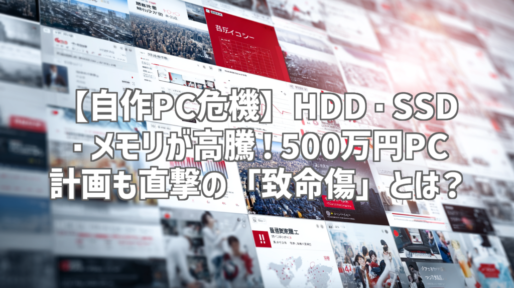 【自作PC危機】HDD・SSD・メモリが高騰!500万円PC計画も直撃の「致命傷」とは? 自作PC愛好家の皆さん、こんにちは!人気のYouTubeレビューブロガー、テックブロガーの〇〇です。今日は、自作PC界隈を震撼させている、ある「深刻な問題」について深掘りし... -