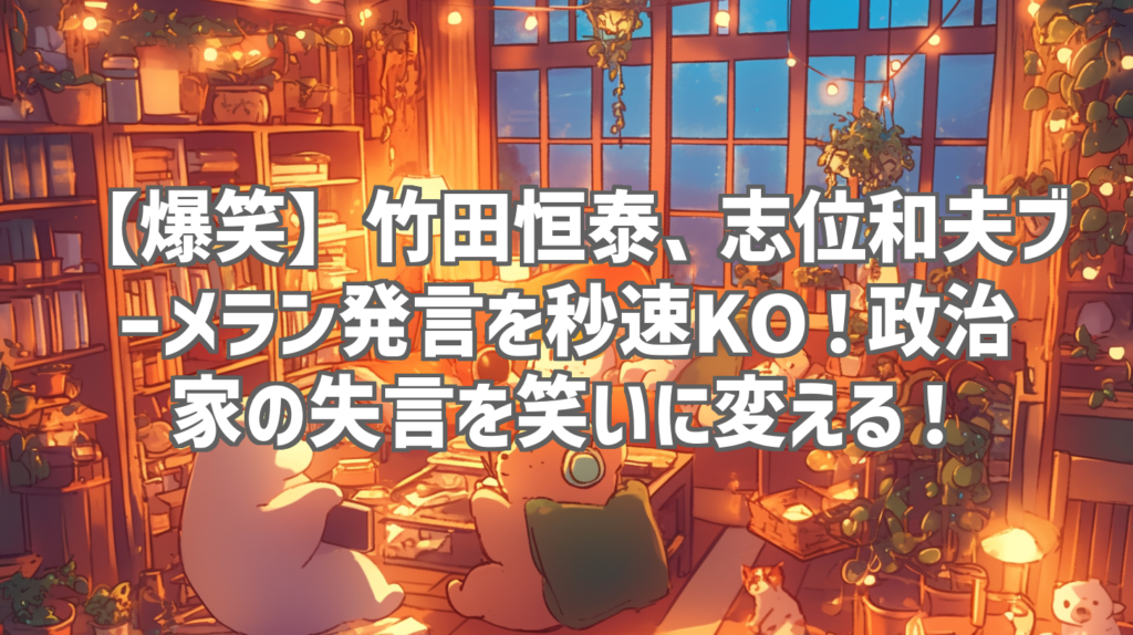 【爆笑】竹田恒泰、志位和夫ブーメラン発言を秒速KO!政治家の失言を笑いに変える! 最近、YouTubeで政治系の動画をよく見るんだけど、中でも「政治ペンギン」さんの動画が面白くてハマってるんだよね。特に今回の動画、「【竹田恒泰】志位和夫のブーメラ... -