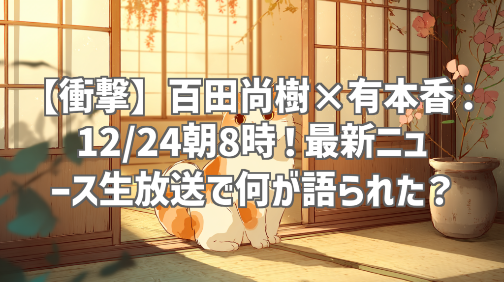 【衝撃】百田尚樹×有本香:12/24朝8時!最新ニュース生放送で何が語られた? 年の瀬も押し迫った2025年12月24日。YouTubeチャンネル「ニュースあさ8時!」では、百田尚樹氏と有本香氏による注目のニュース生放送が行われました。今回の放送では、一体どんな... -