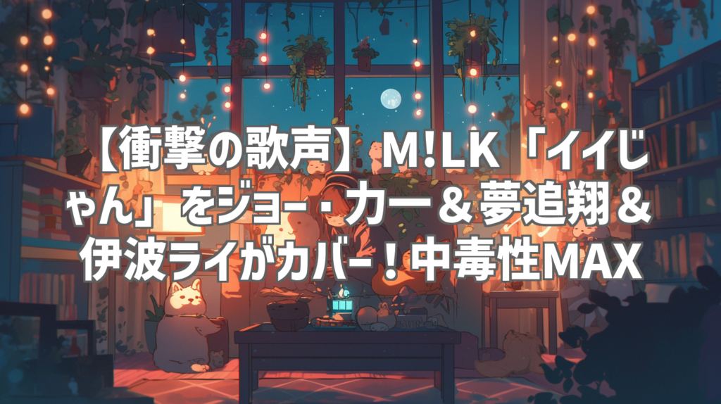 【衝撃の歌声】M!LK「イイじゃん」をジョー・力一&夢追翔&伊波ライがカバー!中毒性MAX いや、これはマジで衝撃だった。普段から色んな音楽を聴いている私だけど、このカバーは完全に予想外の方向から殴られたような感覚。M!LKの「イイじゃん」という曲... -