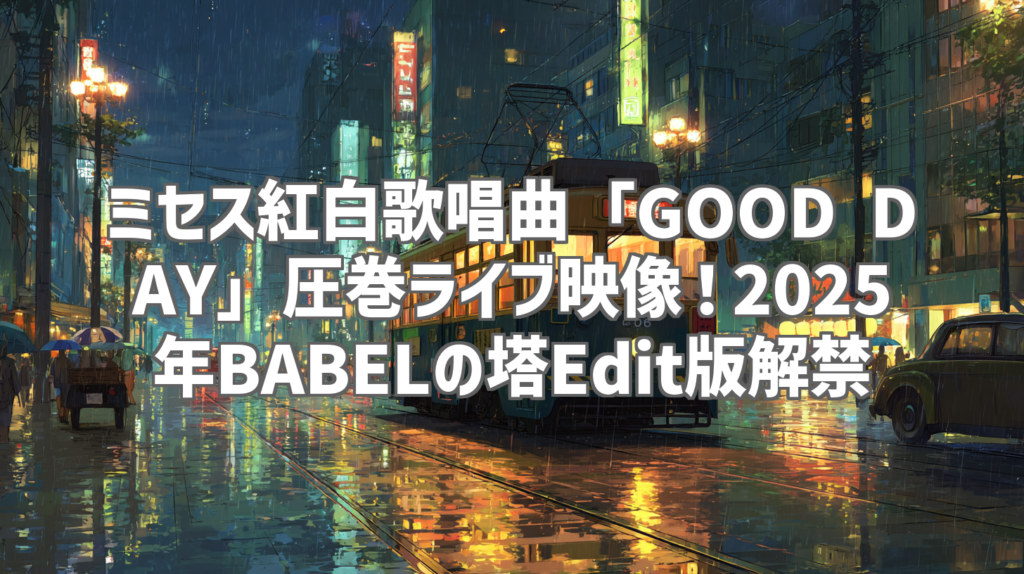 ミセス紅白歌唱曲「GOOD DAY」圧巻ライブ映像!2025年BABELの塔Edit版解禁 年末の興奮が再び!Mrs. GREEN APPLEが第76回NHK紅白歌合戦で披露した「GOOD DAY」のライブ映像が、2025年BABELの塔Edit版としてYouTubeで公開されました。あの感動的なパフォーマ... -