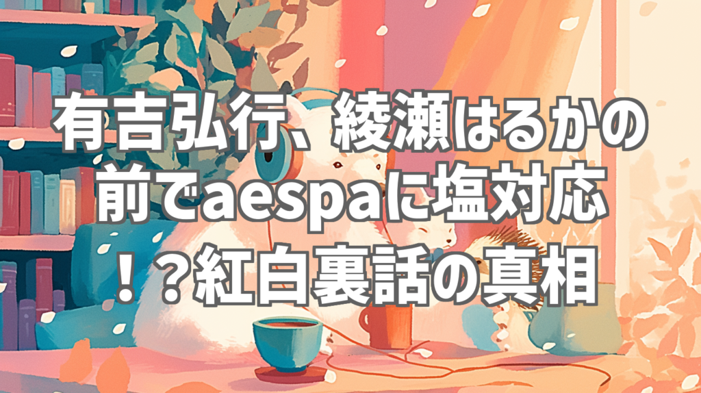 有吉弘行、綾瀬はるかの前でaespaに塩対応!?紅白裏話の真相 年末の国民的イベント、紅白歌合戦。その舞台裏で一体何が起こっていたのか? 今回は、人気お笑い芸人・有吉弘行さんが、女優・綾瀬はるかさんの前で韓国の人気ガールズグループaespaにまさか... -