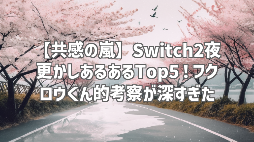 【共感の嵐】Switch2夜更かしあるあるTop5!フクロウくん的考察が深すぎた 皆さん、夜更かししてますか? 特にSwitch2でゲームに没頭して、ついつい時間を忘れてしまう…そんな経験、誰しもありますよね? 今回は、そんな夜更かしゲーマーなら絶対に共感し... -