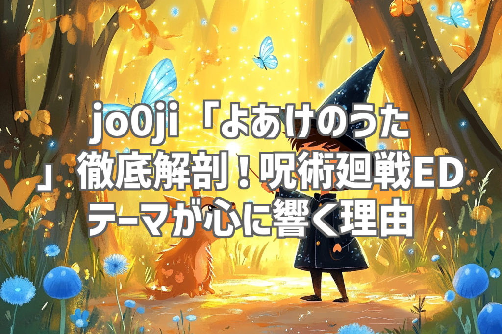 jo0ji「よあけのうた」徹底解剖!呪術廻戦EDテーマが心に響く理由 「よあけのうた」を初めて聴いた時、鳥肌が立ちました。TVアニメ『呪術廻戦』「死滅回游 前編」のエンディングテーマとして書き下ろされたこの楽曲は、jo0jiさんの独特な世界観と、アニメ... -