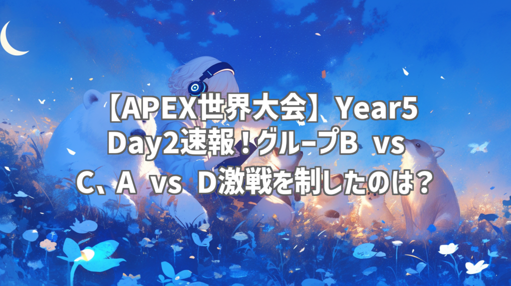 【APEX世界大会】Year5 Day2速報!グループB vs C、A vs D激戦を制したのは? いやー、APEXの世界大会、Year5 Championship Day2、マジで熱かった!グループB vs C、そしてA vs Dの戦い、手に汗握る展開の連続でしたね。私はリアルタイムで観戦してたんで... -