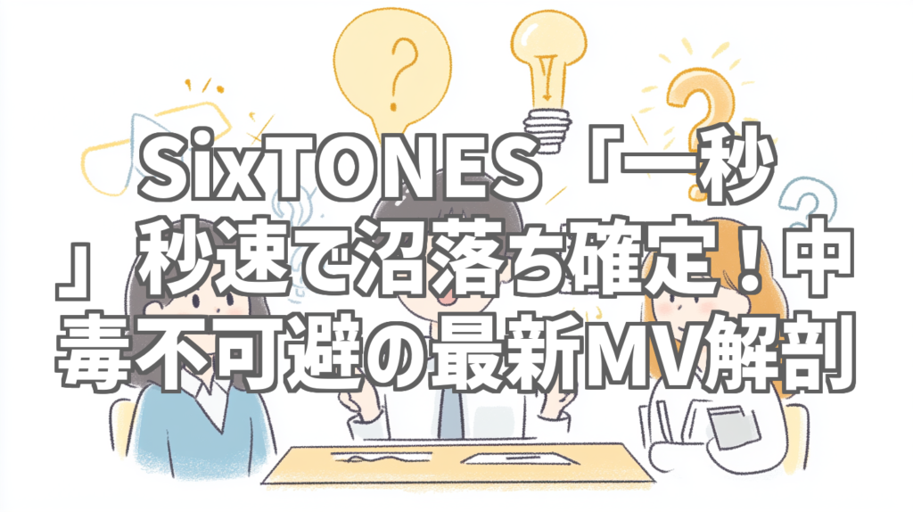SixTONES「一秒」秒速で沼落ち確定!中毒不可避の最新MV解剖 SixTONESの新曲「一秒」のMVが公開されましたね!もう、公開されてからというもの、リピートが止まりません!秒速で沼落ちしてしまった私が、この中毒性MAXのMVを徹底的に解剖します!楽曲の素... -