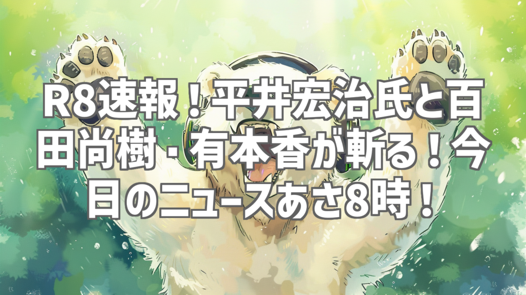 R8速報!平井宏治氏と百田尚樹・有本香が斬る!今日のニュースあさ8時! 待ちに待った「ニュースあさ8時!」、今日も始まりました!今回のゲストはなんと、平井宏治氏!百田尚樹さん、有本香さんと共に、最新のニュースを独自の視点で鋭く斬り込む、目が離... -