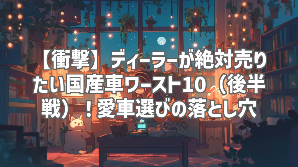 【衝撃】ディーラーが絶対売りたい国産車ワースト10(後半戦)!愛車選びの落とし穴 最近、車の買い替えを検討しているんだけど、ディーラーのセールストークって本当に巧妙だよね。ついつい勧められるがままに契約しそうになるけど、本当にそれって自分に... -