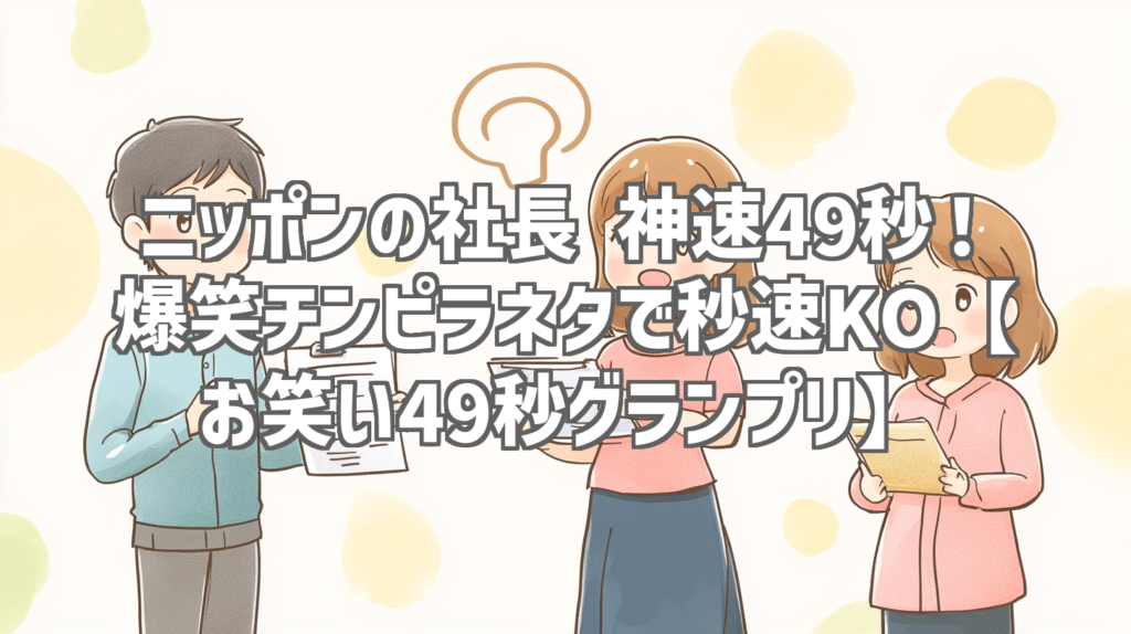 ニッポンの社長 神速49秒!爆笑チンピラネタで秒速KO【お笑い49秒グランプリ】 お笑い好きなら見逃せない!今回は、テレビ朝日公式YouTubeチャンネル「動画、はじめてみました」で公開された、ニッポンの社長の爆笑49秒ネタをご紹介します。わずか49秒の中... -