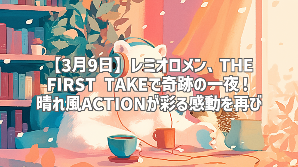 【3月9日】レミオロメン、THE FIRST TAKEで奇跡の一夜!晴れ風ACTIONが彩る感動を再び レミオロメンが、あの名曲「3月9日」をTHE FIRST TAKEで披露!しかも、ただのパフォーマンスではありません。キリンの「晴れ風ACTION」とのコラボレーションで、桜を未... -