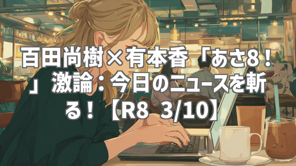 百田尚樹×有本香「あさ8!」激論:今日のニュースを斬る!【R8 3/10】 朝のニュース番組は数あれど、ここまで攻めた内容を届けてくれる番組は他にないでしょう。百田尚樹さんと有本香さんが、その鋭い視点と忖度なしの物言いで、世の中の出来事をズバッと... -