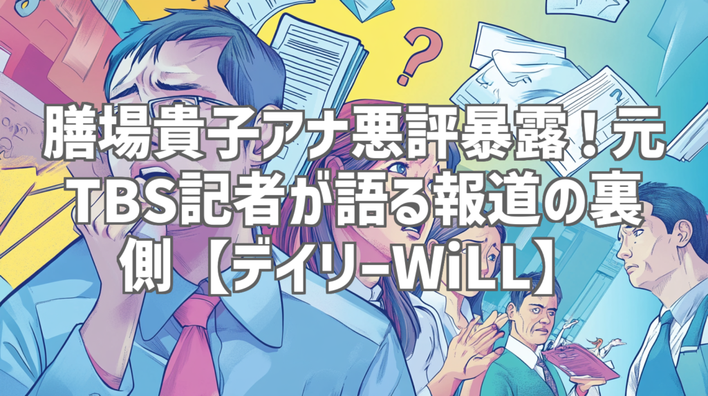 膳場貴子アナ悪評暴露!元TBS記者が語る報道の裏側【デイリーWiLL】 最近、YouTubeでかなり話題になっている動画を発見しました。それは「デイリーWiLL」チャンネルが公開した「【元TBS記者が暴露!】膳場貴子アナ(報道特集・サンモニ)局内の悪評【小林... -