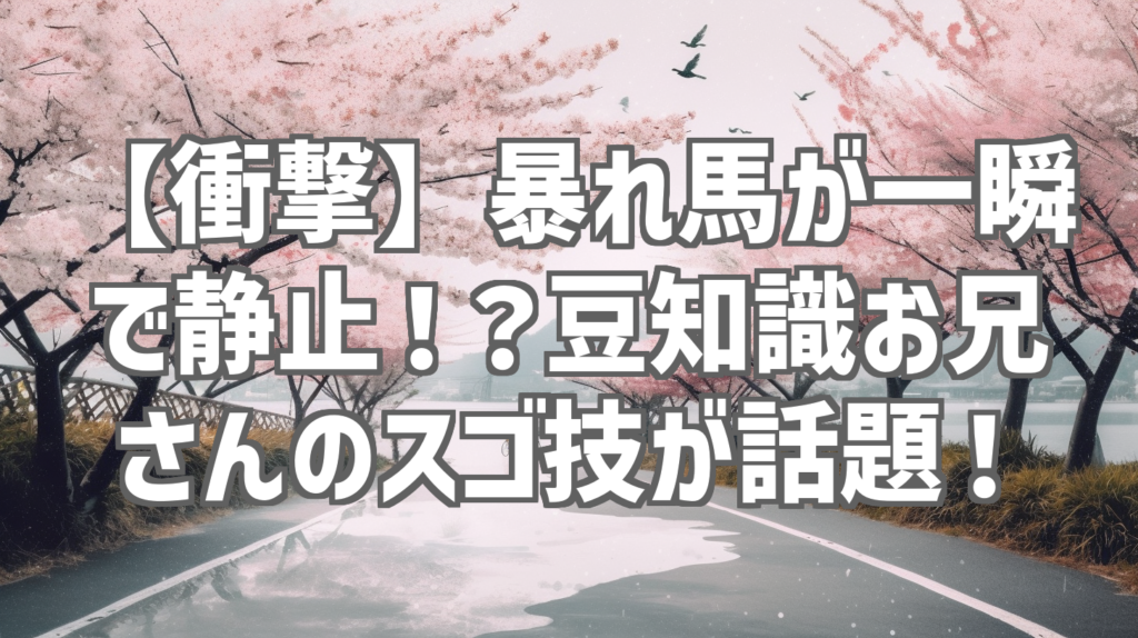 【衝撃】暴れ馬が一瞬で静止!?豆知識お兄さんのスゴ技が話題! YouTubeで話題沸騰中の動画をご存知でしょうか?「豆知識お兄さん」が公開した「暴れていた馬が、一瞬で静まった理由」という動画が、公開から間もなく40万回再生を超える大反響を呼んでい... -