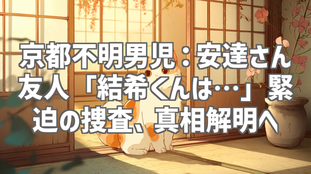 京都不明男児:安達さん友人「結希くんは…」緊迫の捜査、真相解明へ 京都府南丹市で発生した安達結希さんの行方不明事件は、残念ながら遺体で発見されるという痛ましい結末を迎えました。この事件の報道は連日続き、多くの人がその行方を見守っていました... -