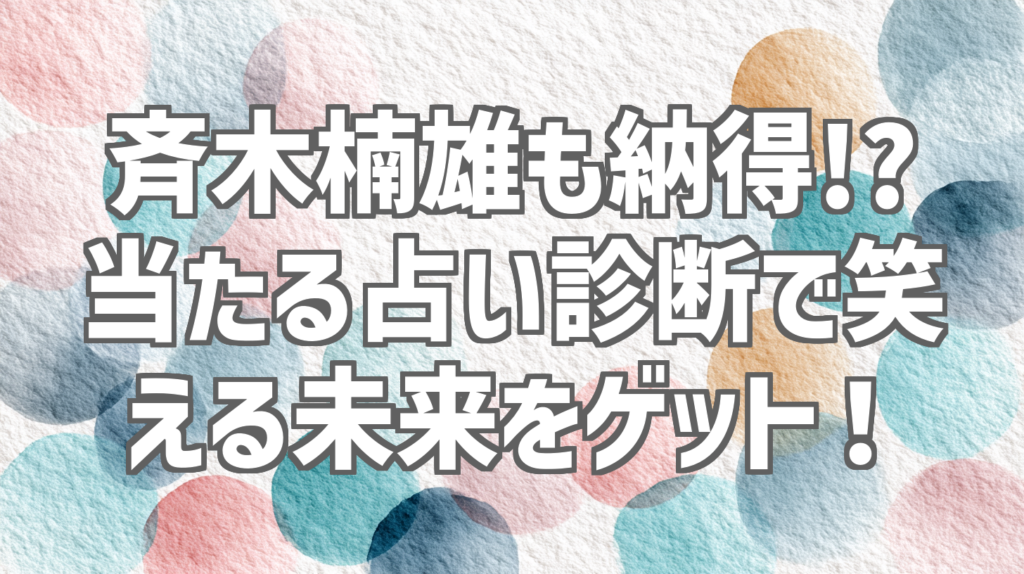 斉木楠雄も納得!? 当たる占い診断で笑える未来をゲット! 最近、SNSで話題になっている「当たる占い診断」動画って知ってますか?私も半信半疑で試してみたんですが、これがもう、笑えるくらいに当たってるんです!特にアニメ「斉木楠雄のΨ難」のファンな... -