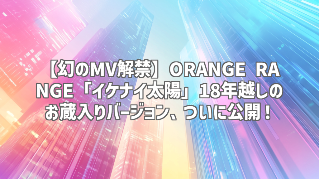 【幻のMV解禁】ORANGE RANGE「イケナイ太陽」18年越しのお蔵入りバージョン、ついに公開! ORANGE RANGEの伝説的名曲「イケナイ太陽」。誰もが一度は耳にしたことがあるであろうこの曲の、なんと18年越しにお蔵入りになっていた幻のMVが公開されたんです!... -