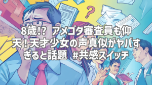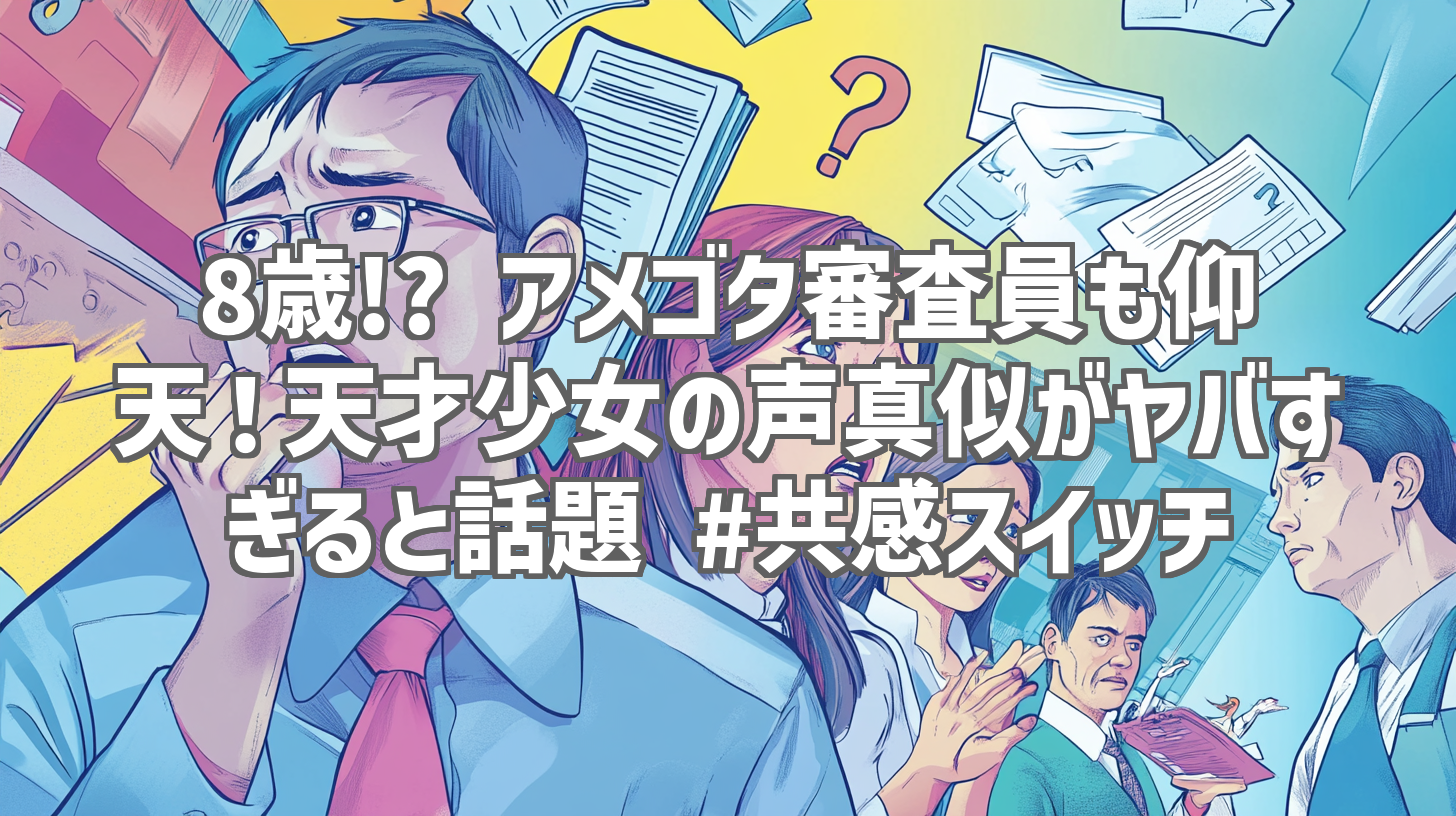 いやー、マジで度肝を抜かれました!YouTubeチャンネル「共感スイッチ」で紹介されていた、アメリカズゴットタレントに出演した8歳の天才少女の声真似動画。たった1分ちょっとの動画なんですが、衝撃と感動で何度もリピートしてしまいました。審査員だけでなく、世界中の視聴者を魅了した彼女のパフォーマンスを、今回は徹底的にレビューしちゃいます!これは見逃し厳禁ですよ!