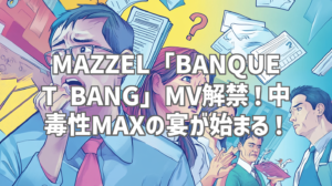 MAZZELの最新MV「BANQUET BANG」が公開されました!公開からわずかな時間で50万回再生を突破し、SNSでも話題沸騰中です。私も早速視聴しましたが、一度聴いたら頭から離れない中毒性MAXの楽曲と、目を奪われるような映像美に圧倒されました!この記事では、「BANQUET BANG」の魅力的なポイントを徹底的にレビューしていきます。まだ視聴していない方は、ぜひMVをチェックしてからこの記事を読んでみてください!