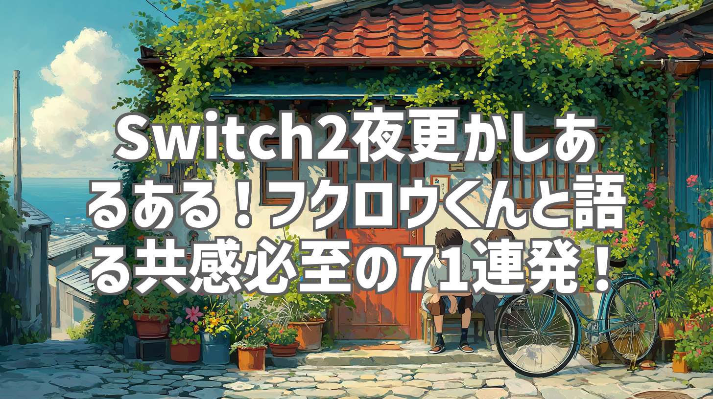 フクロウくんの「Switch2夜更かしあるある!フクロウくんと語る共感必至の71連発!」は、夜更かしゲーマーなら絶対に共感できる、爆笑必至のショート動画です。私も久しぶりに声を出して笑ってしまいました(笑)。たった50秒の中に、共感、笑い、そして未来への期待が詰まったこの動画、ぜひ一度チェックしてみてください!そして、フクロウくんのチャンネルを登録して、これからの動画も楽しみに待ちましょう!夜更かしはほどほどに…(笑)!