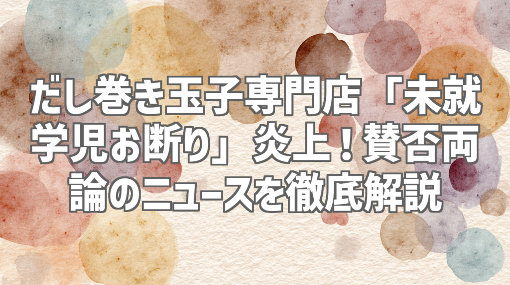 だし巻き玉子専門店「未就学児お断り」炎上!賛否両論のニュースを徹底解説 大阪の人気だし巻き玉子専門店が「未就学児お断り」という方針を打ち出し、SNS上で大きな波紋を呼んでいます。行列ができるほどの人気店がなぜこのような決断に至ったのか? 賛... -