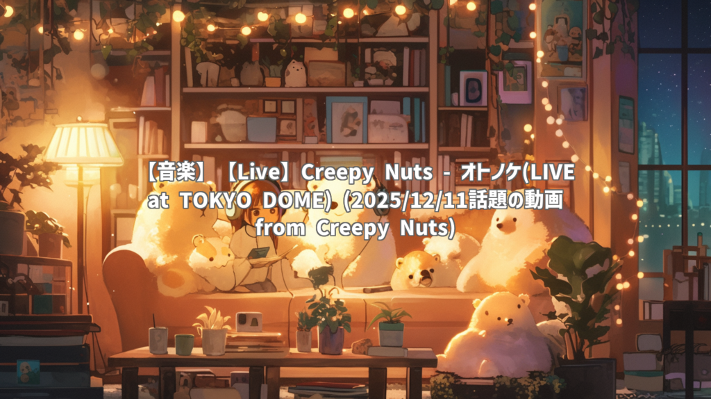 【音楽】【Live】Creepy Nuts - オトノケ(LIVE at TOKYO DOME) (2025/12/11話題の動画 from Creepy Nuts) 動画: 【Live】Creepy Nuts - オトノケ(LIVE at TOKYO DOME) (YouTubeより) 動画情報 チャンネル: Creepy Nuts 公開日: 2025年12月05日 再生回数: ... -