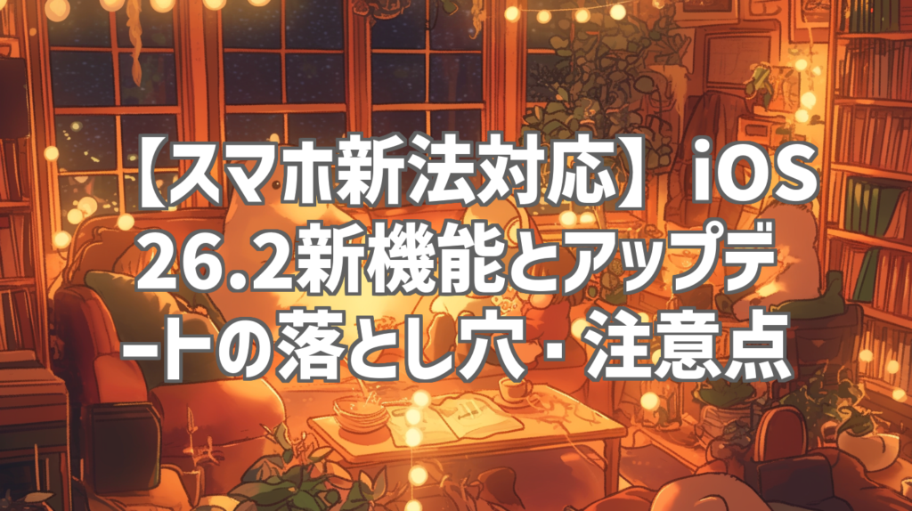 【スマホ新法対応】iOS26.2新機能とアップデートの落とし穴・注意点 iPhoneユーザーの皆さん、こんにちは!日々進化するテクノロジーにワクワクしつつも、新しいアップデートには「一体何が変わるの?」「何か注意することはないの?」と、不安を感じる方... -